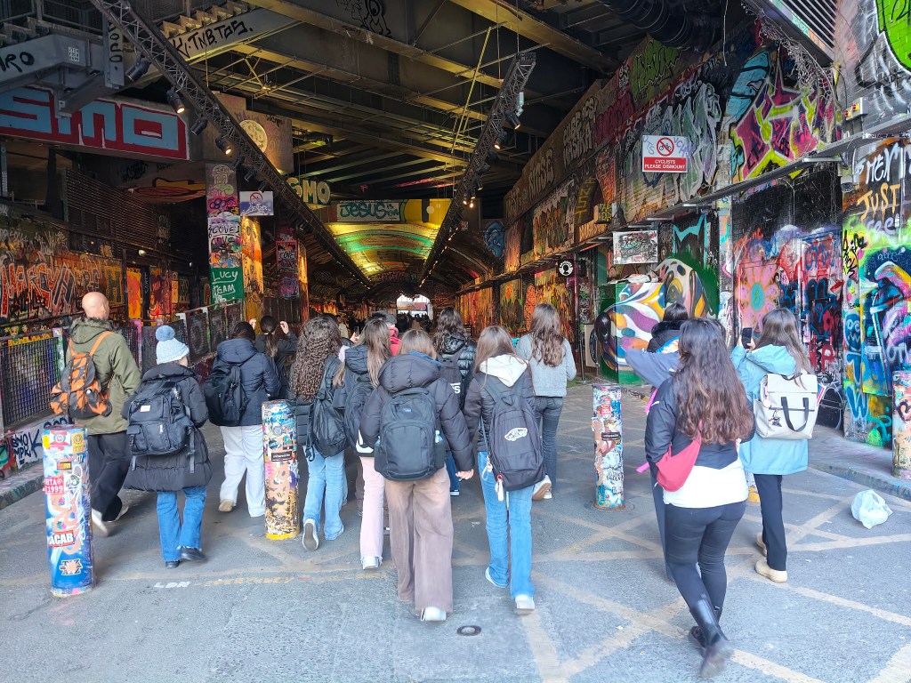 Después de cruzar el Millenial Bridge, hicimos una parada para observar arte Urbano, también conocido como Grafitis.