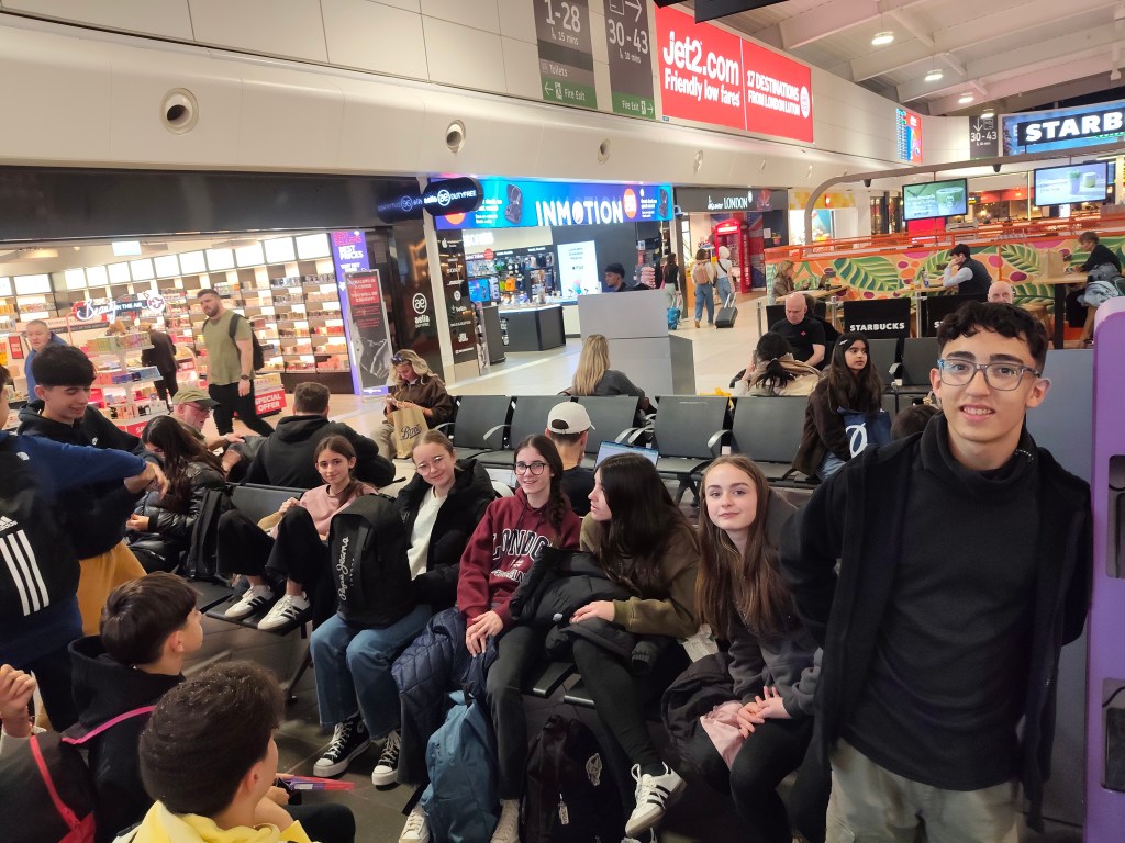 El viaje ha durado unas 2 horas y media. Hemos llegado a la 12.30 al aeropuerto de Luton y al llegar hemos hecho el check-in de las maletas y pasado el control de seguridad que nos ha llevado 1 hora al menos.