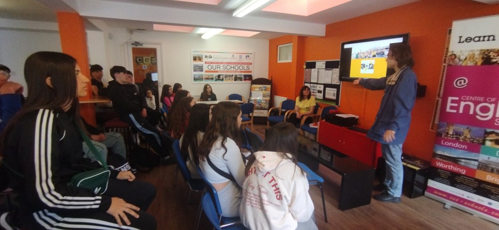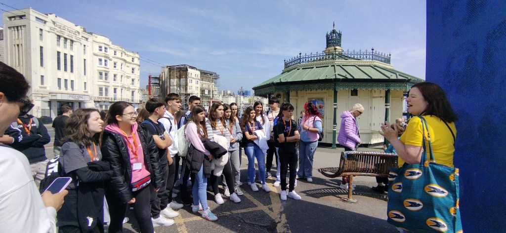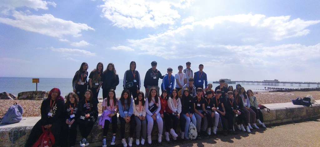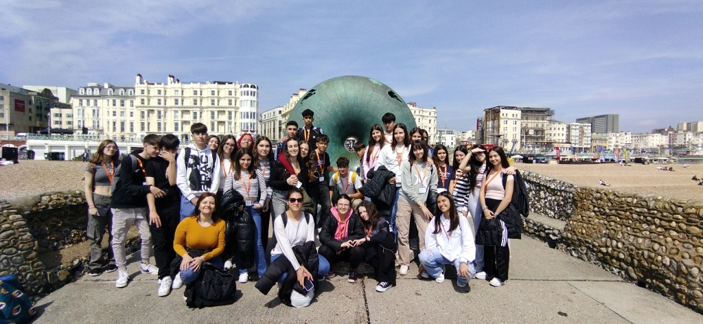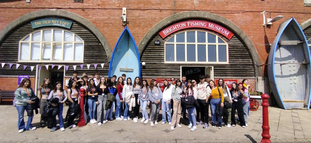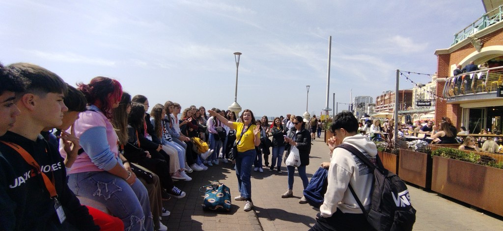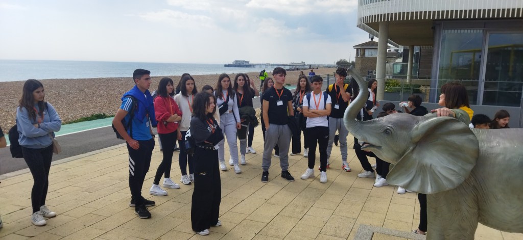 Día 8. Buenas tardes queridas familias y demás lectores. What a day! Estamos estupendamente después de pasar otro día genial. Hemos dado nuestra segunda clase de inglés dónde hemos hecho juegos y practicado mucho el idioma. La excursión de hoy ha sido una visita el pueblo de Brighton y nada más llegar este lugar ya nos ha encantado. Es una ciudad moderna, abierta e inclusiva, muy artística y con mucho ambiente. Hemos paseado por todas las calles principales hasta llegar el paseo marítimo, lleno de bares y de gente en la playa, ¡sí en la playa! por que hoy lo menos ha hecho 23 grados. Hemos visitado el museo de la pesca que era muy interesante. Después la visita obligada al icónico Royal Pavilion, un palacio con un mestizaje de estilos y culturas varias casi indescriptible, pero que nos ha fascinado. Después de esto, nuestra cosa favorita: Free time. Algunos han ido de compras, a visitar las callejuelas antiguas de la ciudad y todos hemos acabado en el famoso muelle de Brighton, lleno de puestos de comida y atracciones de feria tan bonito y antiguo que parece un decorado. Hemos llegado con puntualidad británica al punto de encuentro y con el tren hemos vuelto para Worthing. Como veis no paramos, que para eso hemos venido. Esperamos que os gusten las fotos del día. Good night!