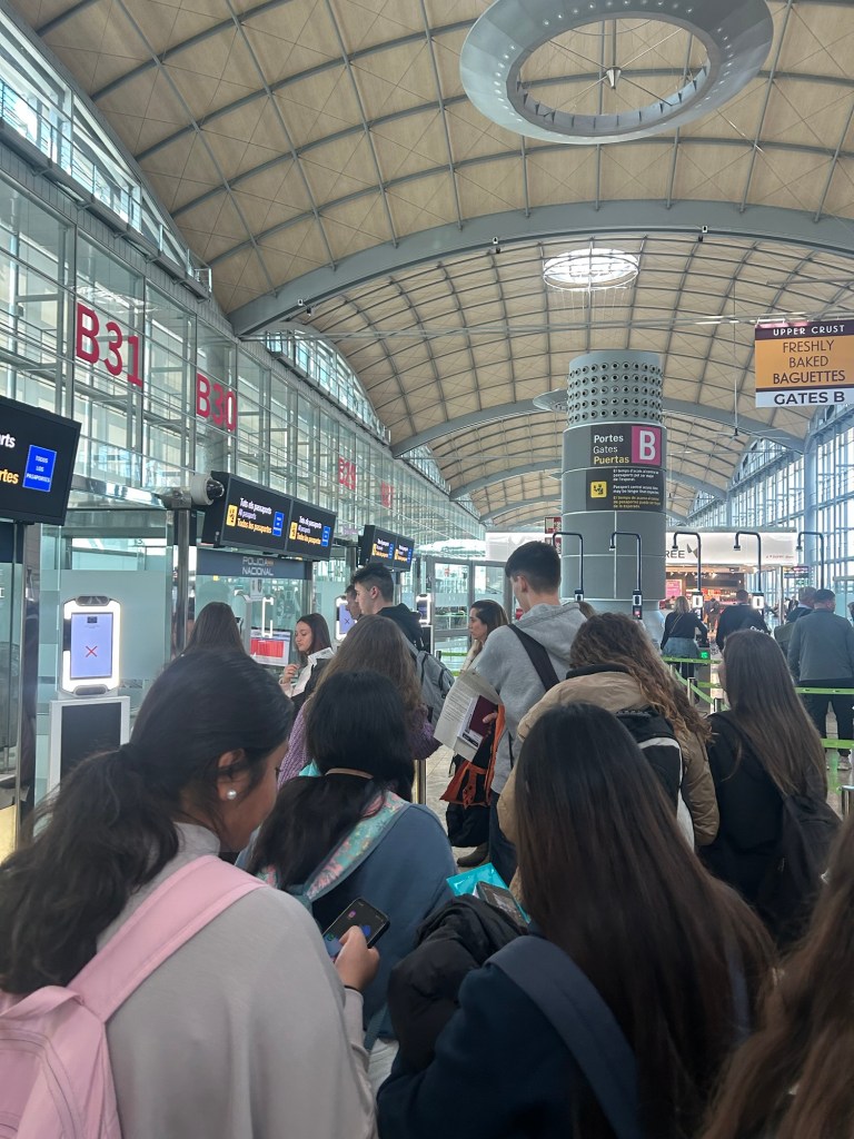 Después de pasar todos los controles, ya estamos en la puerta de embarque a la espera de subir al avión que nos lleva a Glasgow.