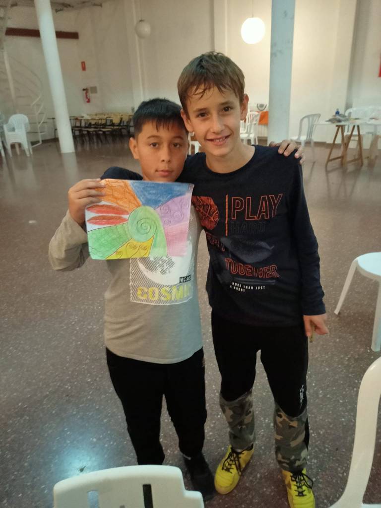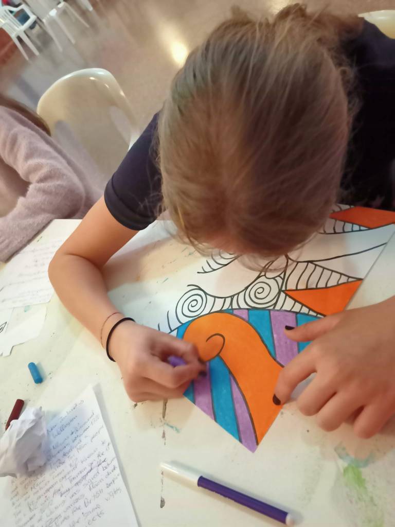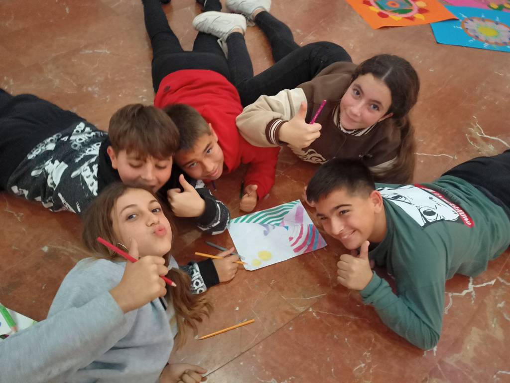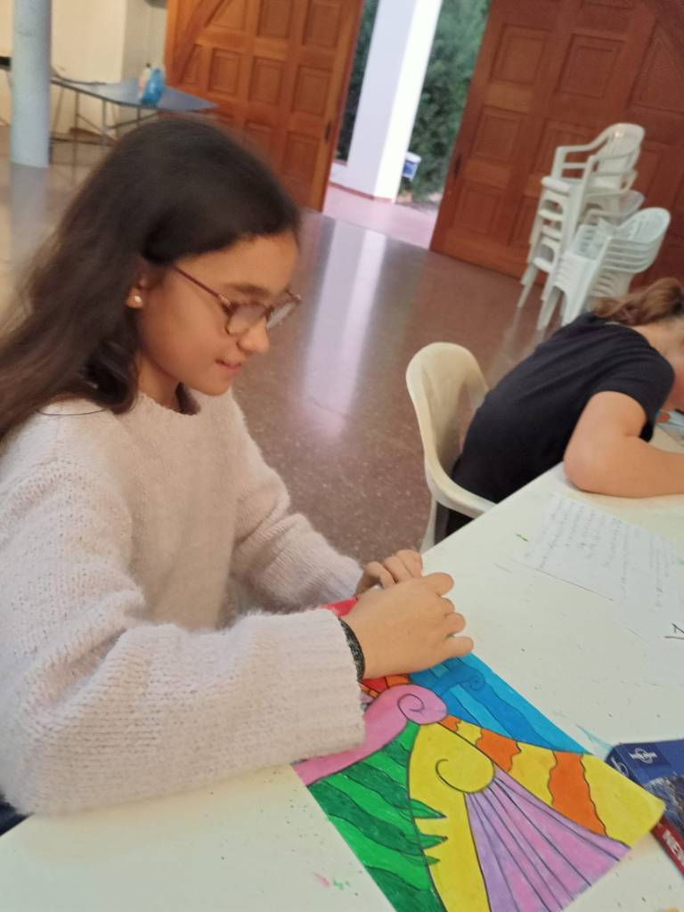 Luego, al final de la mañana, nos toca terminar los Rangoli. Se han quedado muy bien y nos los vamos a llevar al instituto.