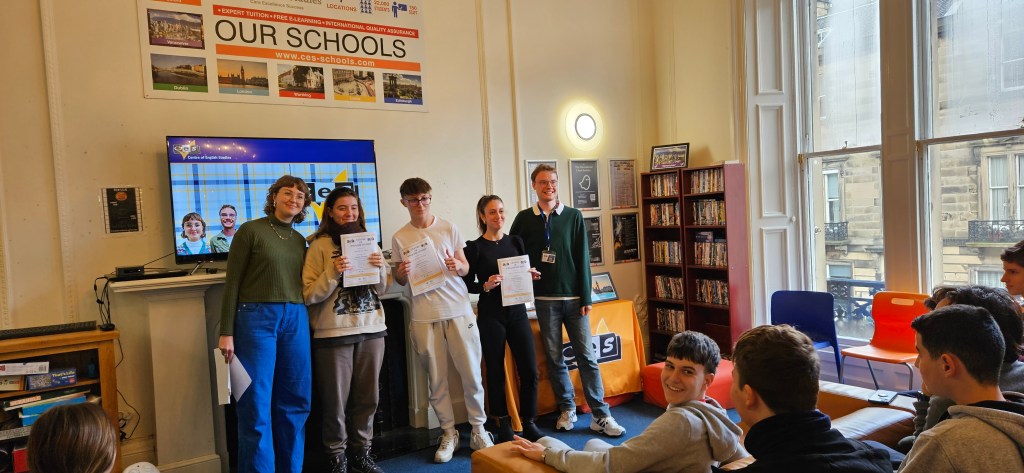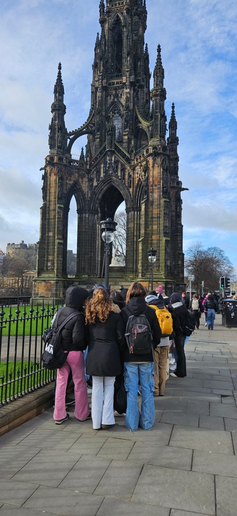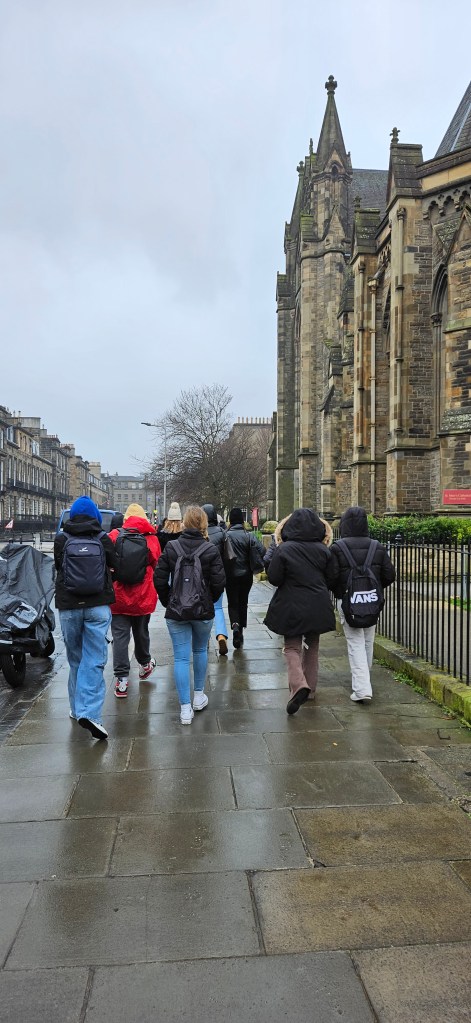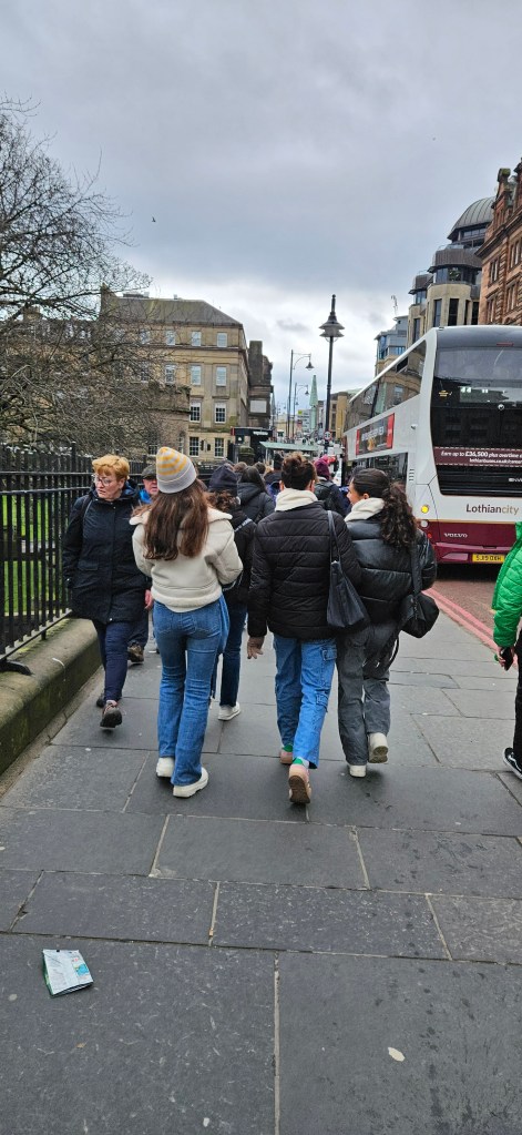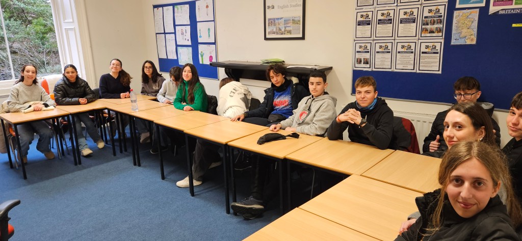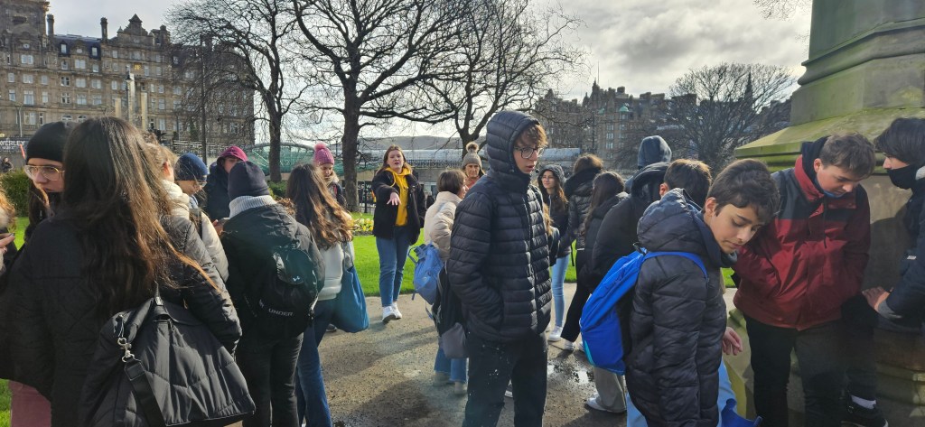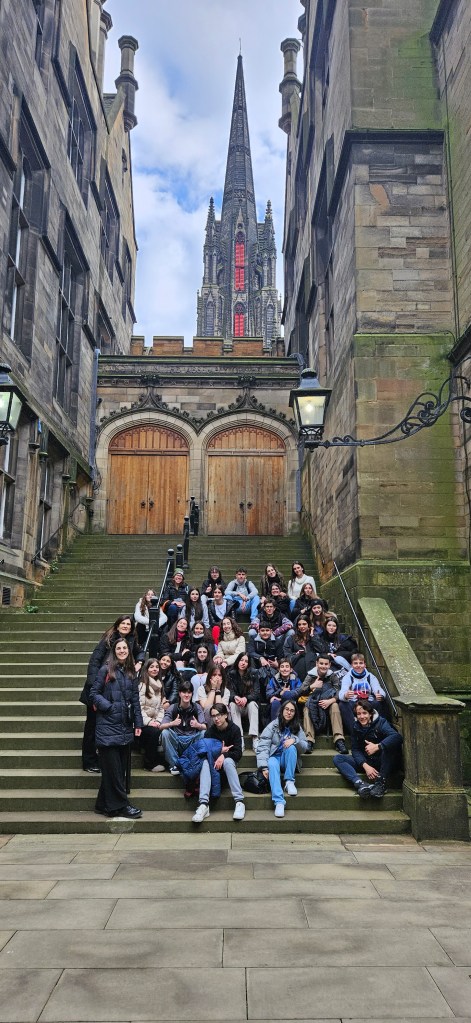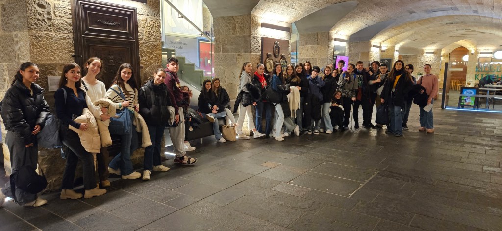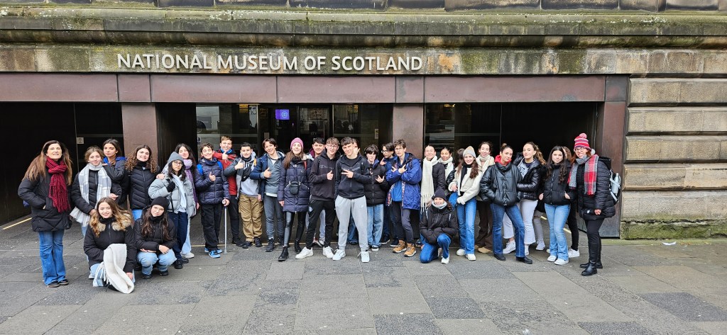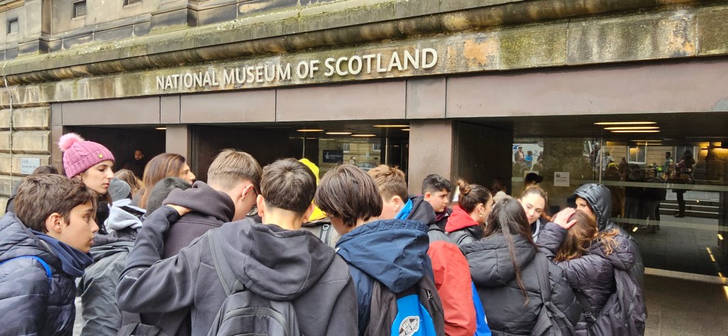 Hoy ha sido otro día bastante completo así como de mucho viento y con una fina lluvia cayendo. A pesar del tiempo adverso hemos completado nuestro planing con éxito. Así, a las 9.15 de la mañana los alumnos han empezado las clases y han terminado a las 12.30 de la mañana. Después, han tenido 1 hora para comer y descansar. A la 1.30 de la tarde hemos recorrido la ciudad hasta llegar al Museo Nacional de Escocia donde los alumnos han hecho una actividad en la cual tenían que buscar objetos y animales significativos dentro del museo y echarse una foto con ellos para mandarla luego por correo. Durante nuestra visita al museo hemos podido conocer mejor la historia de Escocia y de otras culturas del Mundo así como de arte, diseño y moda y sobre Ciencia y Tecnología además de sobre el mundo natural. A las 4 p.m. hemos terminado la visita al museo y los alumnos han tenido tiempo libre para dar una vuelta por la ciudad. Eso ha sido todo por hoy. ¡Buenas noches!
