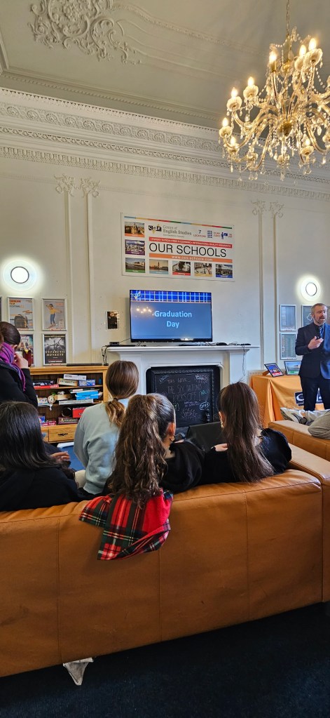 El día ha pasado muy rápido ya que hoy ha sido el ultimo día de clase. Después de asistir a clase, de 12.30 a 13h los alumnos han tenido un acto de graduación donde han recibido su certificado de inglés. Después del acto, los alumnos han comido y seguidamente, nos hemos dirigido hacia el Jardín Botánico de Edimburgo donde hemos disfrutado del maravilloso paisaje y de las distintas variedades de árboles y plantas que hay en él ya que estaba soleado. No obstante, ha empezado a llover y nos hemos refugiado en la cafetería para tomar algo caliente. Nuestra visita ha terminado a las 4 p.m. y después, algunos alumnos han decidido ir de compras y otros volver a casa a descansar. Eso ha sido todo por hoy. Mañana seguiremos informando. ¡¡Buenas noches a tod@s!!