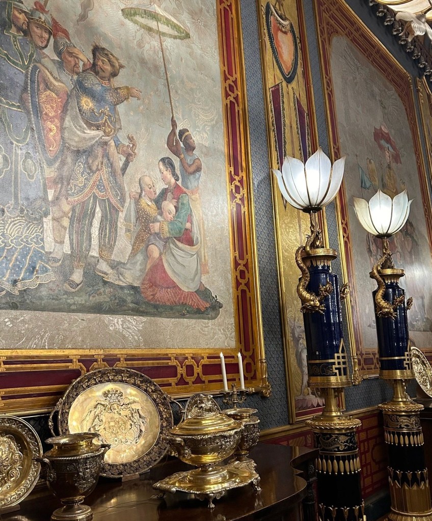 Arquitectura típica hindú, vajillas de porcelana china, lámparas del Siam y alfombras de Pakistán son algunas de las cosas que podemos encontrar dentro.
