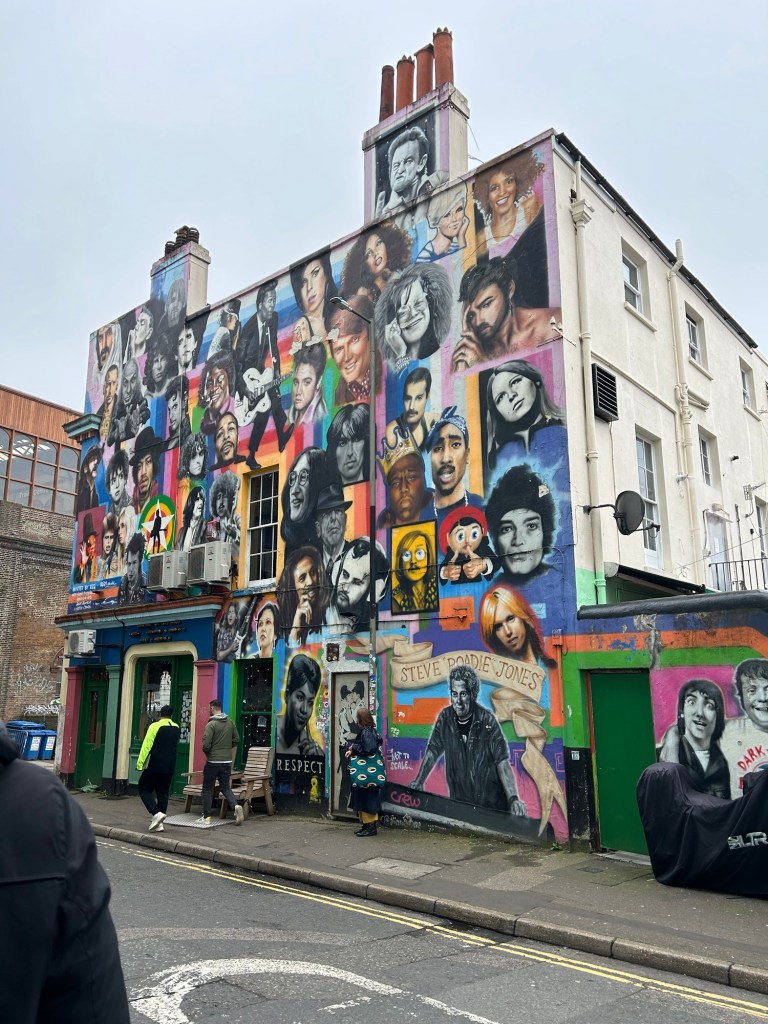 Nuestra primera parada tras pasear un poco por las calles de Brighton, es el famoso mural cubiertos con músicos famosos en el Prince Albert pub en Trafalgar Street.